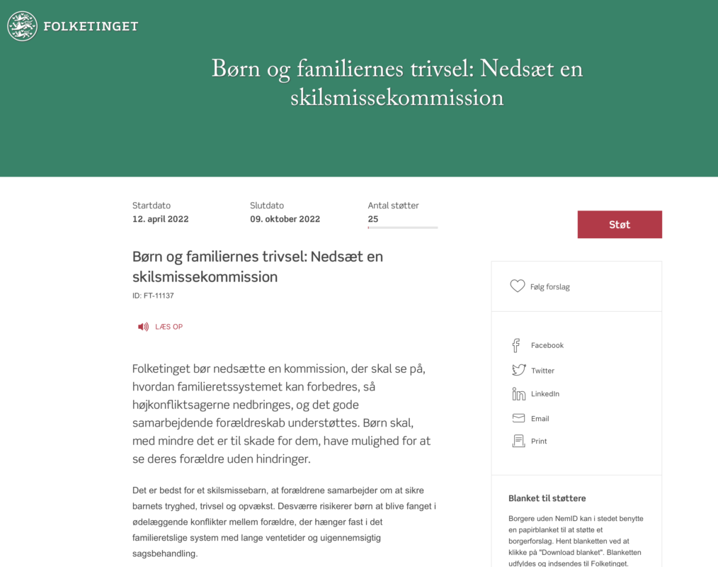 BarnetsTarv.dk har sammen med folkene bag Foreningen Hvor er far og journalist/forfatter Anders Wendt Jensen fra podcasten “Uden min datter” begået et borgerforslag om at få forandret det familieretslige system. Du kan høre vores fælles podcastindslag om borgerforslaget her: udenmindatter.dk Vores perspektiv på det familieretslige system er, at der er nogle grundlæggende fejl, der skal […]